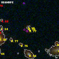 Object #2335 x,y = (2877, 2785) RA, Dec = (00:32:09.672, 18:08:09.96) = (8.04030, 18.13610) BPZ = 0.774 [0.167--2.957] type = 10.30 (SB3_B10 - SB11_A_0_l) chisq2 = 0.44 ODDS = 0.23 z_cluster = 0.396