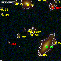 Object #2431 x,y = (2390, 2744) RA, Dec = (00:32:11.712, 18:08:07.44) = (8.04880, 18.13540) BPZ = 0.172 [0.072--1.004] type = 8.50 (SB2_B10 - SB1_B10) chisq2 = 0.23 ODDS = 0.19 z_cluster = 0.396