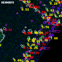 Object #2551 x,y = (4636, 2698) RA, Dec = (00:32:02.256, 18:08:04.56) = (8.00940, 18.13460) BPZ = 0.680 [0.443--1.725] type = 8.70 (SB2_B10 - SB1_B10) chisq2 = 0.01 ODDS = 0.24 z_cluster = 0.396