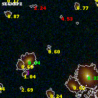 Object #2670 x,y = (2294, 2639) RA, Dec = (00:32:12.120, 18:08:01.32) = (8.05050, 18.13370) BPZ = 0.604 [0.102--3.301] type = 9.70 (SB3_B10 - SB2_B10) chisq2 = 0.45 ODDS = 0.20 z_cluster = 0.396