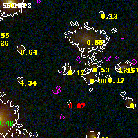 Object #2900 x,y = (2835, 2535) RA, Dec = (00:32:09.840, 18:07:54.84) = (8.04100, 18.13190) BPZ = 0.175 [0.081--3.362] type = 9.10 (SB2_B10 - SB3_B10) chisq2 = 0.54 ODDS = 0.20 z_cluster = 0.396