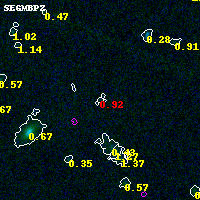 Object #3512 x,y = (3939, 2237) RA, Dec = (00:32:05.208, 18:07:37.20) = (8.02170, 18.12700) BPZ = 0.915 [0.577--1.764] type = 8.20 (SB1_B10 - SB2_B10) chisq2 = 2.27 ODDS = 0.28 z_cluster = 0.396