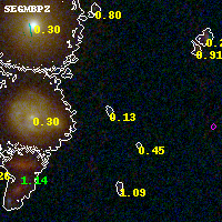 Object #3612 x,y = (3536, 2192) RA, Dec = (00:32:06.888, 18:07:34.32) = (8.02870, 18.12620) BPZ = 0.134 [0.090--0.267] type = 10.90 (SB11_A_0_l - SB3_B10) chisq2 = 0.62 ODDS = 0.73 z_cluster = 0.396