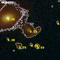 Object #3955 x,y = (2634, 1481) RA, Dec = (00:32:10.704, 18:06:51.84) = (8.04460, 18.11440) BPZ = 0.690 [0.583--0.763] type = 7.70 (SB1_B10 - Scd_B10) chisq2 = 0.18 ODDS = 0.89 z_cluster = 0.396