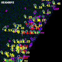Object #4031 x,y = (4374, 2187) RA, Dec = (00:32:03.384, 18:07:33.96) = (8.01410, 18.12610) BPZ = 0.831 [0.605--6.794] type = 1.00 (Ell7_A_0) chisq2 = 0.00 ODDS = 0.11 z_cluster = 0.396