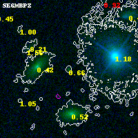 Object #4063 x,y = (1169, 1903) RA, Dec = (00:32:16.872, 18:07:17.04) = (8.07030, 18.12140) BPZ = 0.663 [0.354--1.578] type = 6.50 (Scd_B10 - Sbc_B10) chisq2 = 0.01 ODDS = 0.22 z_cluster = 0.396