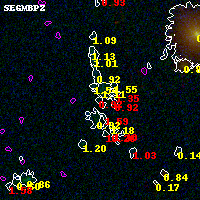 Object #4170 x,y = (1576, 1844) RA, Dec = (00:32:15.144, 18:07:13.44) = (8.06310, 18.12040) BPZ = 0.922 [0.239--2.577] type = 10.20 (SB3_B10 - SB11_A_0_l) chisq2 = 2.97 ODDS = 0.16 z_cluster = 0.396