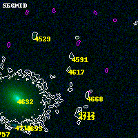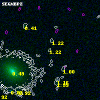 Object #4617 x,y = (1319, 1552) RA, Dec = (00:32:16.224, 18:06:55.80) = (8.06760, 18.11550) BPZ = 1.217 [0.184--3.420] type = 8.70 (SB2_B10 - SB1_B10) chisq2 = 0.00 ODDS = 0.09 z_cluster = 0.396