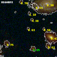 Object #5002 x,y = (2163, 1270) RA, Dec = (00:32:12.672, 18:06:39.24) = (8.05280, 18.11090) BPZ = 0.626 [0.351--0.986] type = 9.00 (SB2_B10) chisq2 = 0.40 ODDS = 0.30 z_cluster = 0.396