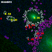 Object #5118 x,y = (1586, 1171) RA, Dec = (00:32:15.096, 18:06:33.12) = (8.06290, 18.10920) BPZ = 0.914 [0.437--5.025] type = 7.80 (SB1_B10 - Scd_B10) chisq2 = 1.67 ODDS = 0.19 z_cluster = 0.396