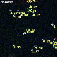 Object #5361 x,y = (2046, 976) RA, Dec = (00:32:13.176, 18:06:21.24) = (8.05490, 18.10590) BPZ = 0.455 [0.221--4.281] type = 6.40 (Sbc_B10 - Scd_B10) chisq2 = 0.10 ODDS = 0.18 z_cluster = 0.396