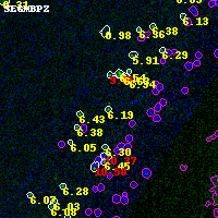 Object #5611 x,y = (3409, 724) RA, Dec = (00:32:07.440, 18:06:06.48) = (8.03100, 18.10180) BPZ = 6.193 [5.939--8.059] type = 9.50 (SB3_B10 - SB2_B10) chisq2 = 0.00 ODDS = 0.77 z_cluster = 0.396