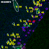 Object #5812 x,y = (3270, 470) RA, Dec = (00:32:08.016, 18:05:51.00) = (8.03340, 18.09750) BPZ = 5.910 [5.798--6.206] type = 9.40 (SB2_B10 - SB3_B10) chisq2 = 0.03 ODDS = 0.97 z_cluster = 0.396