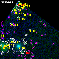 Object #6106 x,y = (2063, 4898) RA, Dec = (00:32:13.104, 18:10:16.68) = (8.05460, 18.17130) BPZ = 1.057 [0.205--4.523] type = 9.60 (SB3_B10 - SB2_B10) chisq2 = 0.00 ODDS = 0.07 z_cluster = 0.396
