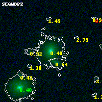 Object #821 x,y = (1940, 3776) RA, Dec = (00:32:13.608, 18:09:09.36) = (8.05670, 18.15260) BPZ = 0.404 [0.316--0.452] type = 5.10 (ES0_B10 - Sbc_B10) chisq2 = 0.00 ODDS = 0.85 z_cluster = 0.396