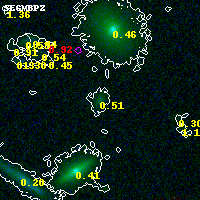 Object #838 x,y = (2970, 3778) RA, Dec = (00:32:09.288, 18:09:09.36) = (8.03870, 18.15260) BPZ = 0.507 [0.240--0.682] type = 6.70 (Scd_B10 - Sbc_B10) chisq2 = 0.00 ODDS = 0.47 z_cluster = 0.396