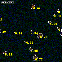 Object #107 x,y = (2838, 3390) RA, Dec = (00:32:09.840, 18:08:46.32) = (8.04100, 18.14620) BPZ = 0.814 [0.253--5.162] type = 7.90 (SB1_B10 - Scd_B10) chisq2 = 0.19 ODDS = 0.14 z_cluster = 0.396
