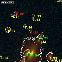 Object #1104 x,y = (3351, 1511) RA, Dec = (00:32:07.680, 18:06:53.64) = (8.03200, 18.11490) BPZ = 0.308 [0.130--3.890] type = 8.70 (SB2_B10 - SB1_B10) chisq2 = 1.02 ODDS = 0.15 z_cluster = 0.396