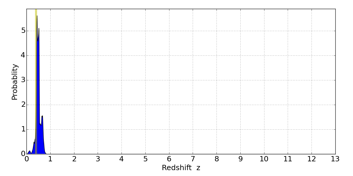 In P(z) plots: Yellow lines mark the cluster redshift z = 0.396,