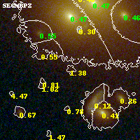 Object #1127 x,y = (2910, 1461) RA, Dec = (00:32:09.528, 18:06:50.40) = (8.03970, 18.11400) BPZ = 1.379 [0.658--2.746] type = 6.80 (Scd_B10 - Sbc_B10) chisq2 = 0.43 ODDS = 0.20 z_cluster = 0.396