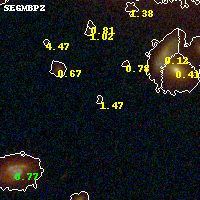 Object #1171 x,y = (2880, 1369) RA, Dec = (00:32:09.648, 18:06:45.00) = (8.04020, 18.11250) BPZ = 1.469 [0.638--3.244] type = 10.30 (SB3_B10 - SB11_A_0_l) chisq2 = 0.68 ODDS = 0.13 z_cluster = 0.396
