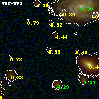 Object #1209 x,y = (2163, 1270) RA, Dec = (00:32:12.672, 18:06:38.88) = (8.05280, 18.11080) BPZ = 0.586 [0.225--4.095] type = 8.40 (SB1_B10 - SB2_B10) chisq2 = 0.38 ODDS = 0.23 z_cluster = 0.396