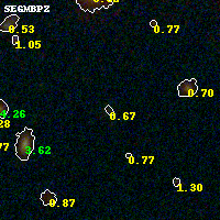 Object #150 x,y = (1886, 3326) RA, Dec = (00:32:13.848, 18:08:42.36) = (8.05770, 18.14510) BPZ = 0.670 [0.122--3.408] type = 9.70 (SB3_B10 - SB2_B10) chisq2 = 0.44 ODDS = 0.23 z_cluster = 0.396