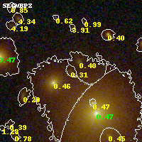 Object #154 x,y = (2318, 3299) RA, Dec = (00:32:12.024, 18:08:40.92) = (8.05010, 18.14470) BPZ = 0.307 [0.170--0.812] type = 6.20 (Sbc_B10 - Scd_B10) chisq2 = 0.08 ODDS = 0.27 z_cluster = 0.396