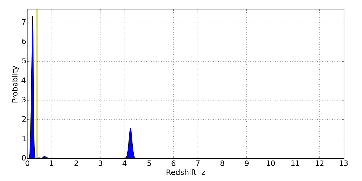 In P(z) plots: Yellow lines mark the cluster redshift z = 0.396,