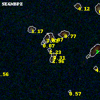 Object #205 x,y = (1572, 3219) RA, Dec = (00:32:15.168, 18:08:35.88) = (8.06320, 18.14330) BPZ = 2.234 [1.143--2.662] type = 10.00 (SB3_B10) chisq2 = 0.29 ODDS = 0.41 z_cluster = 0.396