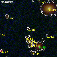 Object #260 x,y = (3078, 3088) RA, Dec = (00:32:08.832, 18:08:27.96) = (8.03680, 18.14110) BPZ = 1.349 [0.543--1.744] type = 9.30 (SB2_B10 - SB3_B10) chisq2 = 0.67 ODDS = 0.27 z_cluster = 0.396