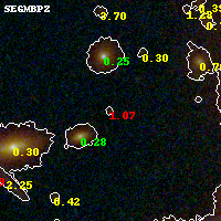 Object #267 x,y = (2151, 3128) RA, Dec = (00:32:12.720, 18:08:30.48) = (8.05300, 18.14180) BPZ = 1.069 [0.266--5.829] type = 8.60 (SB2_B10 - SB1_B10) chisq2 = 1.10 ODDS = 0.15 z_cluster = 0.396
