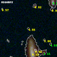Object #273 x,y = (1705, 3067) RA, Dec = (00:32:14.616, 18:08:26.88) = (8.06090, 18.14080) BPZ = 4.551 [0.502--5.297] type = 8.60 (SB2_B10 - SB1_B10) chisq2 = 0.08 ODDS = 0.41 z_cluster = 0.396