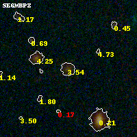 Object #303 x,y = (3393, 3018) RA, Dec = (00:32:07.488, 18:08:24.00) = (8.03120, 18.14000) BPZ = 3.536 [3.364--3.760] type = 8.80 (SB2_B10 - SB1_B10) chisq2 = 0.11 ODDS = 0.92 z_cluster = 0.396