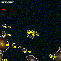Object #414 x,y = (2868, 2799) RA, Dec = (00:32:09.720, 18:08:10.68) = (8.04050, 18.13630) BPZ = 0.915 [0.378--5.958] type = 7.60 (SB1_B10 - Scd_B10) chisq2 = 0.58 ODDS = 0.10 z_cluster = 0.396