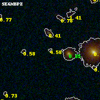 Object #427 x,y = (2006, 2782) RA, Dec = (00:32:13.344, 18:08:09.60) = (8.05560, 18.13600) BPZ = 4.577 [4.058--5.026] type = 10.60 (SB11_A_0_l - SB3_B10) chisq2 = 0.18 ODDS = 0.71 z_cluster = 0.396