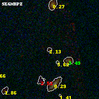 Object #44 x,y = (3346, 3509) RA, Dec = (00:32:07.704, 18:08:53.52) = (8.03210, 18.14820) BPZ = 2.132 [1.602--11.090] type = 5.40 (ES0_B10 - Sbc_B10) chisq2 = 0.38 ODDS = 0.14 z_cluster = 0.396