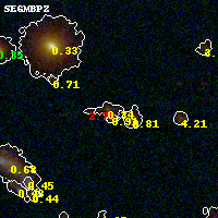 Object #461 x,y = (2145, 2719) RA, Dec = (00:32:12.744, 18:08:06.00) = (8.05310, 18.13500) BPZ = 0.337 [0.132--0.555] type = 7.40 (Scd_B10 - SB1_B10) chisq2 = 0.13 ODDS = 0.48 z_cluster = 0.396