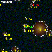 Object #678 x,y = (3079, 2323) RA, Dec = (00:32:08.832, 18:07:42.24) = (8.03680, 18.12840) BPZ = 4.845 [4.739--5.081] type = 9.60 (SB3_B10 - SB2_B10) chisq2 = 0.75 ODDS = 0.97 z_cluster = 0.396