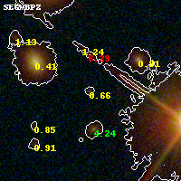 Object #697 x,y = (1972, 2296) RA, Dec = (00:32:13.488, 18:07:40.80) = (8.05620, 18.12800) BPZ = 0.658 [0.444--0.912] type = 9.50 (SB3_B10 - SB2_B10) chisq2 = 0.92 ODDS = 0.38 z_cluster = 0.396