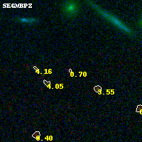 Object #7 x,y = (2829, 3630) RA, Dec = (00:32:09.864, 18:09:00.72) = (8.04110, 18.15020) BPZ = 0.705 [0.251--5.036] type = 9.00 (SB2_B10) chisq2 = 0.36 ODDS = 0.08 z_cluster = 0.396