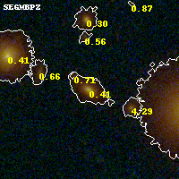 Object #702 x,y = (3225, 2274) RA, Dec = (00:32:08.208, 18:07:39.36) = (8.03420, 18.12760) BPZ = 0.412 [0.315--0.453] type = 3.50 (Ell4_A_0 - Ell5_A_0) chisq2 = 0.05 ODDS = 0.85 z_cluster = 0.396