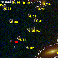 Object #745 x,y = (2445, 2207) RA, Dec = (00:32:11.496, 18:07:35.40) = (8.04790, 18.12650) BPZ = 0.329 [0.067--3.471] type = 8.60 (SB2_B10 - SB1_B10) chisq2 = 0.34 ODDS = 0.29 z_cluster = 0.396