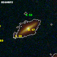 Object #772 x,y = (3206, 2102) RA, Dec = (00:32:08.280, 18:07:28.92) = (8.03450, 18.12470) BPZ = 0.468 [0.383--0.501] type = 4.30 (Ell4_A_0 - ES0_B10) chisq2 = 0.01 ODDS = 0.86 z_cluster = 0.396