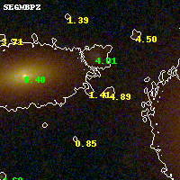 Object #793 x,y = (2722, 2089) RA, Dec = (00:32:10.320, 18:07:28.20) = (8.04300, 18.12450) BPZ = 1.412 [0.525--2.774] type = 7.90 (SB1_B10 - Scd_B10) chisq2 = 0.13 ODDS = 0.16 z_cluster = 0.396