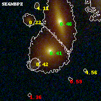 Object #818 x,y = (2018, 1930) RA, Dec = (00:32:13.296, 18:07:18.48) = (8.05540, 18.12180) BPZ = 0.410 [0.364--0.464] type = 4.50 (ES0_B10 - Ell4_A_0) chisq2 = 0.03 ODDS = 0.98 z_cluster = 0.396