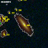 Object #828 x,y = (3426, 1979) RA, Dec = (00:32:07.368, 18:07:21.72) = (8.03070, 18.12270) BPZ = 0.403 [0.332--0.437] type = 4.10 (Ell4_A_0 - ES0_B10) chisq2 = 0.03 ODDS = 0.94 z_cluster = 0.396