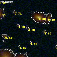Object #830 x,y = (1753, 2012) RA, Dec = (00:32:14.400, 18:07:23.52) = (8.06000, 18.12320) BPZ = 4.655 [4.502--5.156] type = 9.70 (SB3_B10 - SB2_B10) chisq2 = 0.83 ODDS = 0.84 z_cluster = 0.396