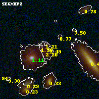 Object #831 x,y = (3342, 2004) RA, Dec = (00:32:07.704, 18:07:23.16) = (8.03210, 18.12310) BPZ = 1.486 [1.129--2.431] type = 6.20 (Sbc_B10 - Scd_B10) chisq2 = 0.68 ODDS = 0.32 z_cluster = 0.396