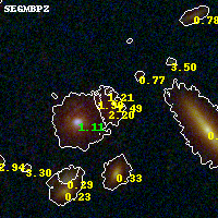 Object #835 x,y = (3335, 1998) RA, Dec = (00:32:07.752, 18:07:22.80) = (8.03230, 18.12300) BPZ = 2.196 [1.867--2.397] type = 6.90 (Scd_B10 - Sbc_B10) chisq2 = 0.09 ODDS = 0.67 z_cluster = 0.396